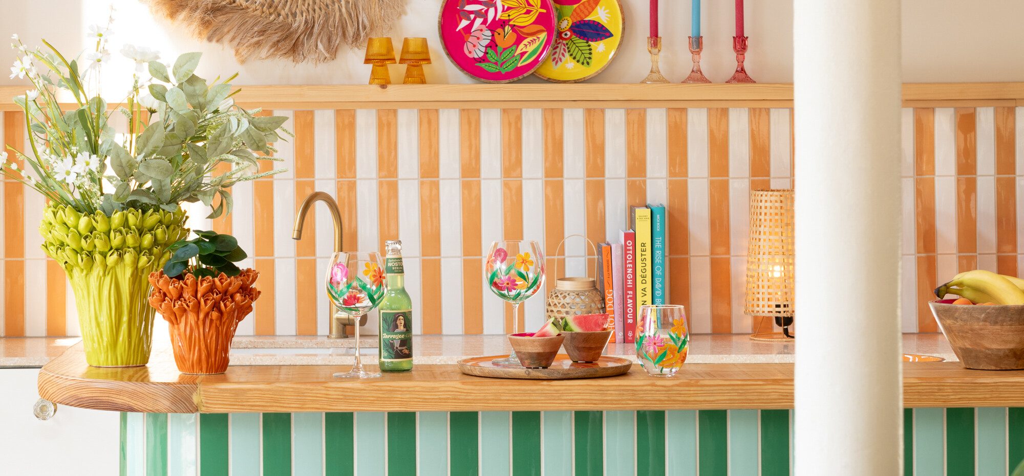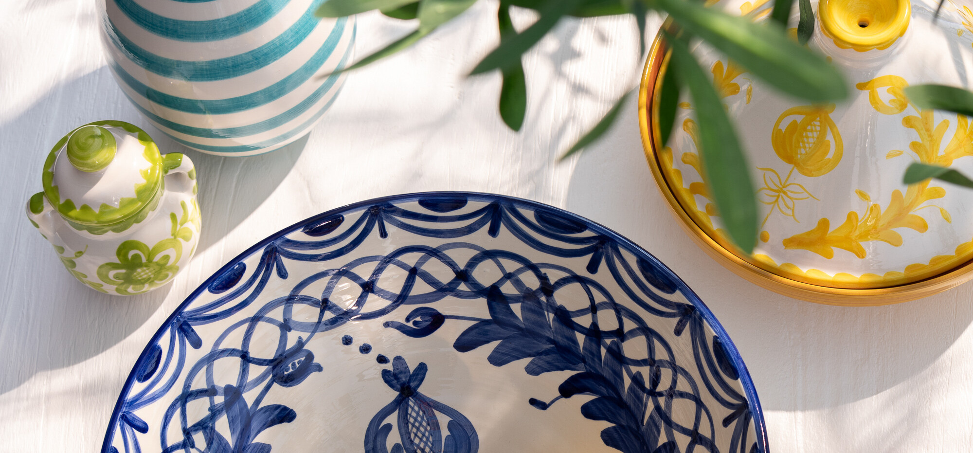 Гранада вдъхва жизнения дух на Южна Испания чрез ръчно изработена керамика. От купи и чинии до чинии и саксии, всяко парче е боядисано с ярки цветове като жълто, кобалтово синьо, синьо-зелено, оранжево и зелено. С два различни модела, Fajalauza и ивици, тези парчета са идеални за смесване и съпоставяне, създавайки оживено изживяване за хранене на открито със семейството и приятелите.