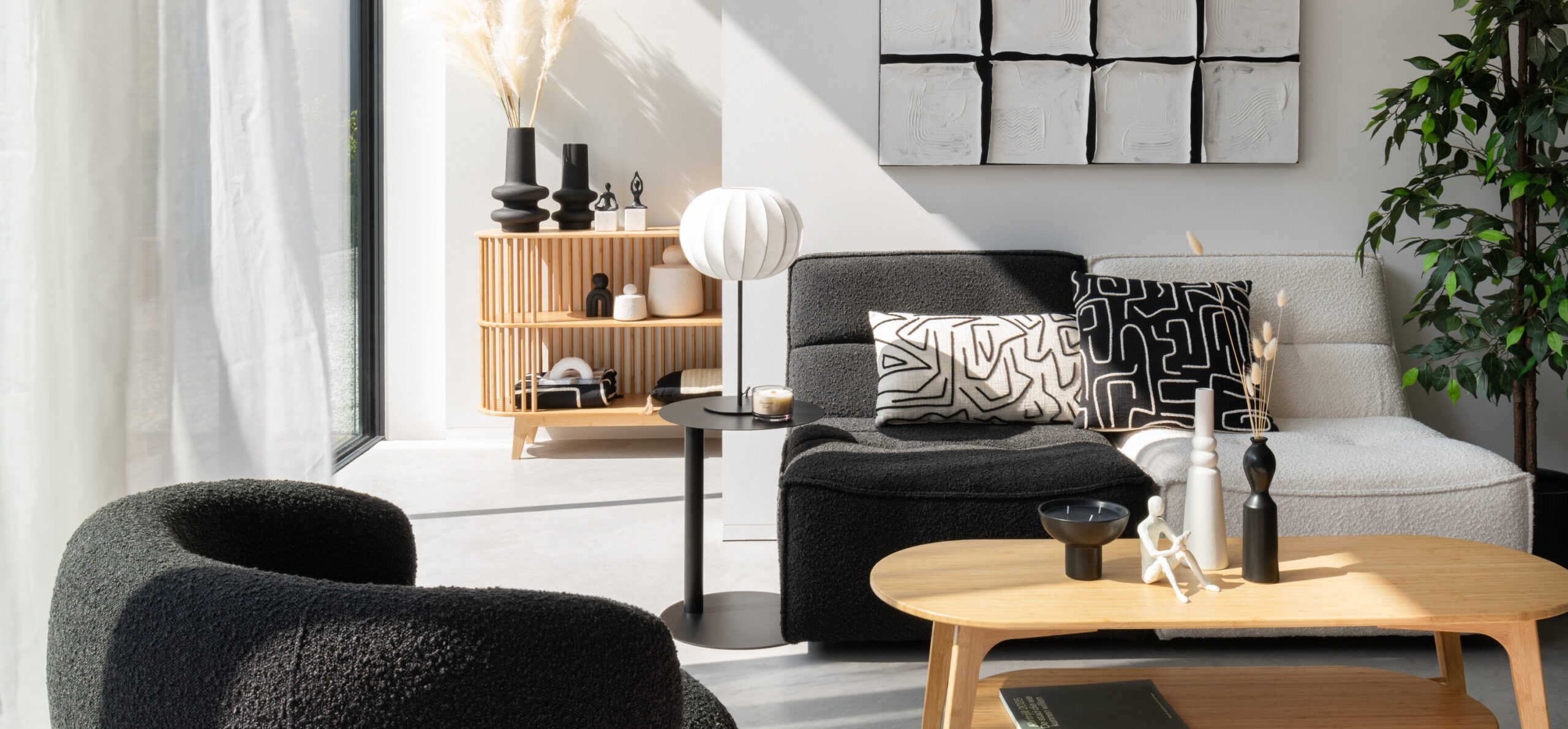 Черното и бялото се срещат с естествени материали като дърво, ратан и шнур, за да създадат минималистичен външен вид, който свързва модерния стил с японската традиция. Взаимодействието на линии в текстил и керамика добавя дълбочина, докато типичният японски декор за стени внася топлина и автентичност.