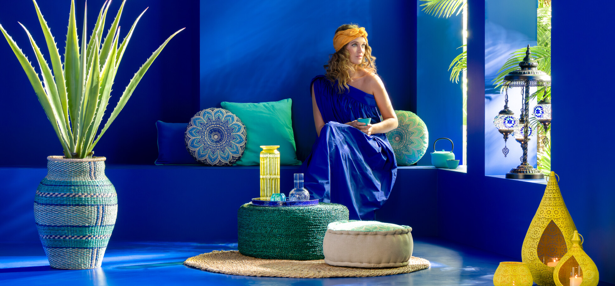 Живи сини и топли жълти цветове се срещат с марокански модели, носейки усещането за огрени от слънце дворове и спокоен средиземноморски живот. Лесна комбинация от цвят и текстура, осигуряваща спокоен начин да внесете топлина и индивидуалност във вашия дом.